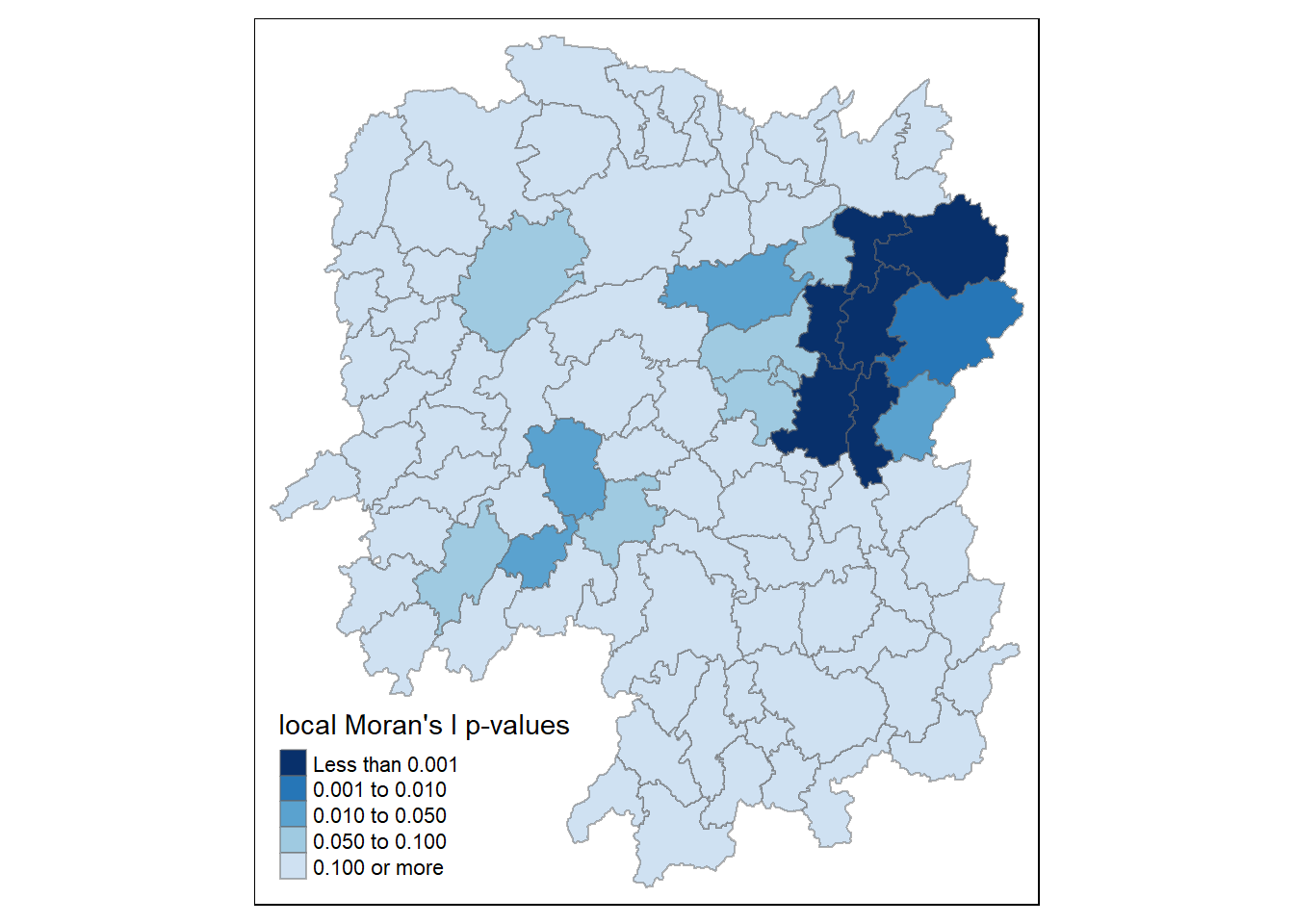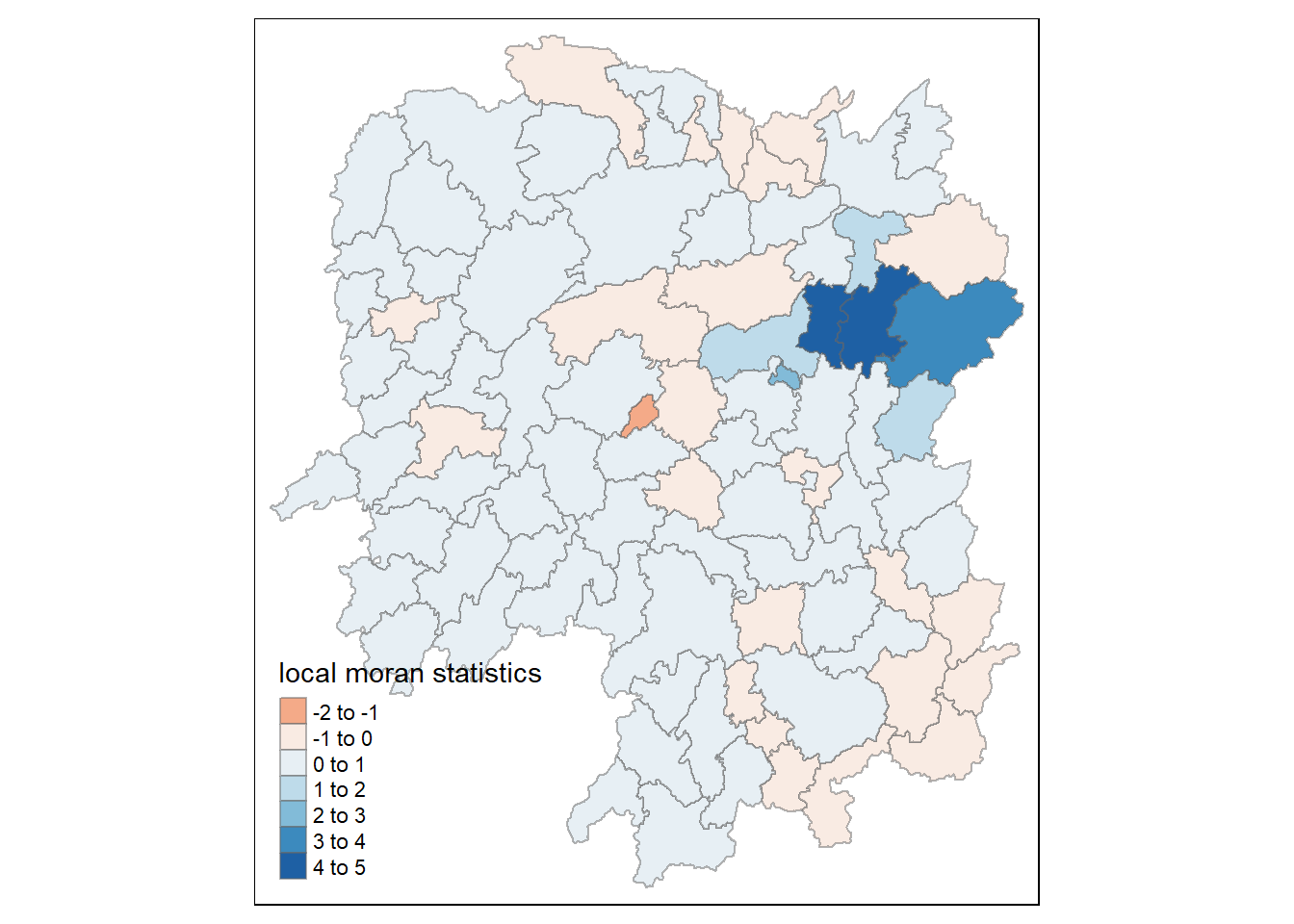 The summary report above shows that there are 88 area units in Hunan. The most connected area unit has 11 neighbours. There are two area units with only one neighbour.