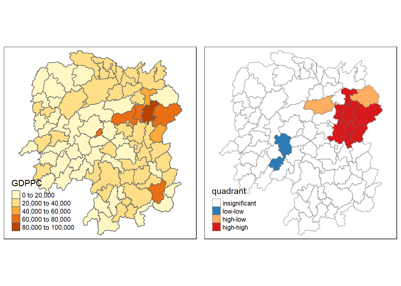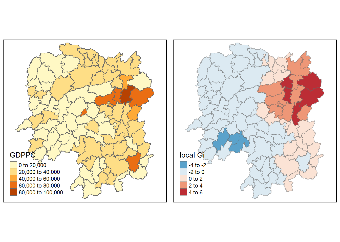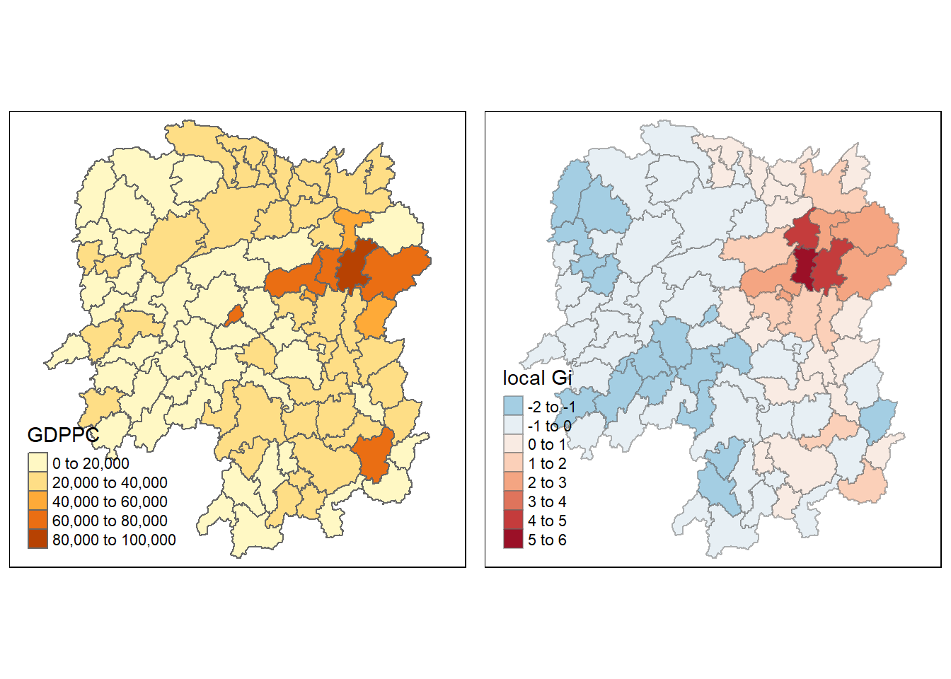 tmap_arrange(gdppc, Gimap, asp=1, ncol=2)Variable(s) "gstat_fixed" contains positive and negative values, so midpoint is set to 0. Set midpoint = NA to show the full spectrum of the color palette.