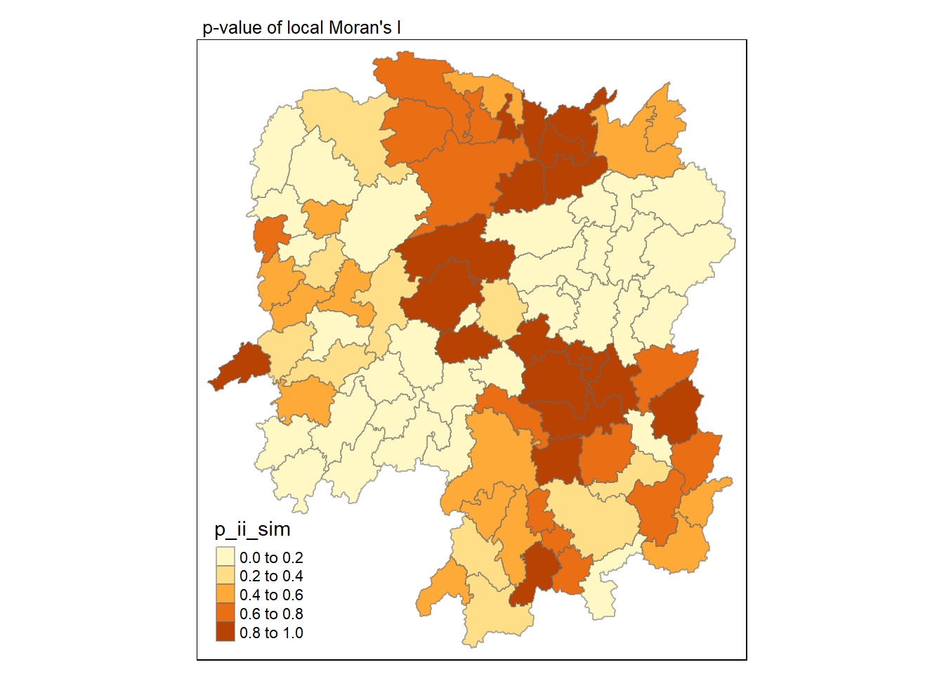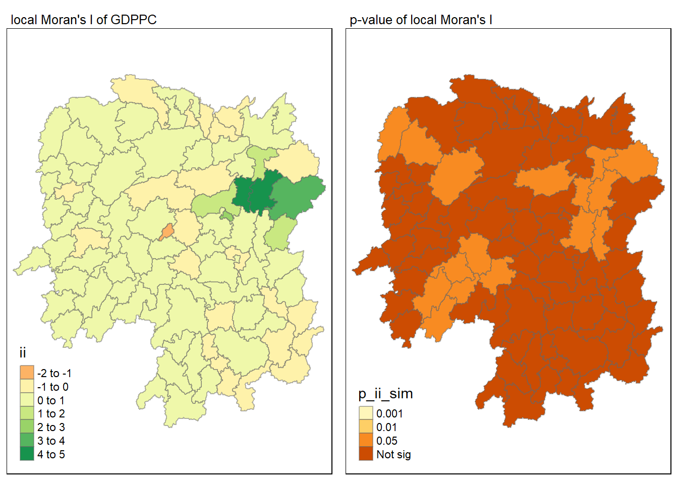 p_ii: p-value of local moran statistic using pnorm(); for localmoran_perm using standard deviatse based on permutation sample means and standard deviations